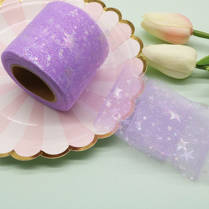 Блестящее решение для вашего творчества! Узкий декоративный фатин с рисунком из звезд — это универсальный материал для создания нежных и эффектных деталей. Формат пятиметровой ленты шириной 5.5 см особенно удобен для мастеров, создающих серии украшений или занимающихся праздничным оформлением в Алматы.
