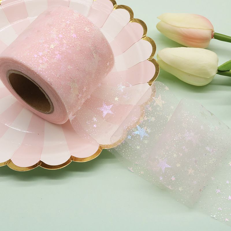 Блестящее решение для вашего творчества! Узкий декоративный фатин с рисунком из звезд — это универсальный материал для создания нежных и эффектных деталей. Формат пятиметровой ленты шириной 5.5 см особенно удобен для мастеров, создающих серии украшений или занимающихся праздничным оформлением в Алматы.