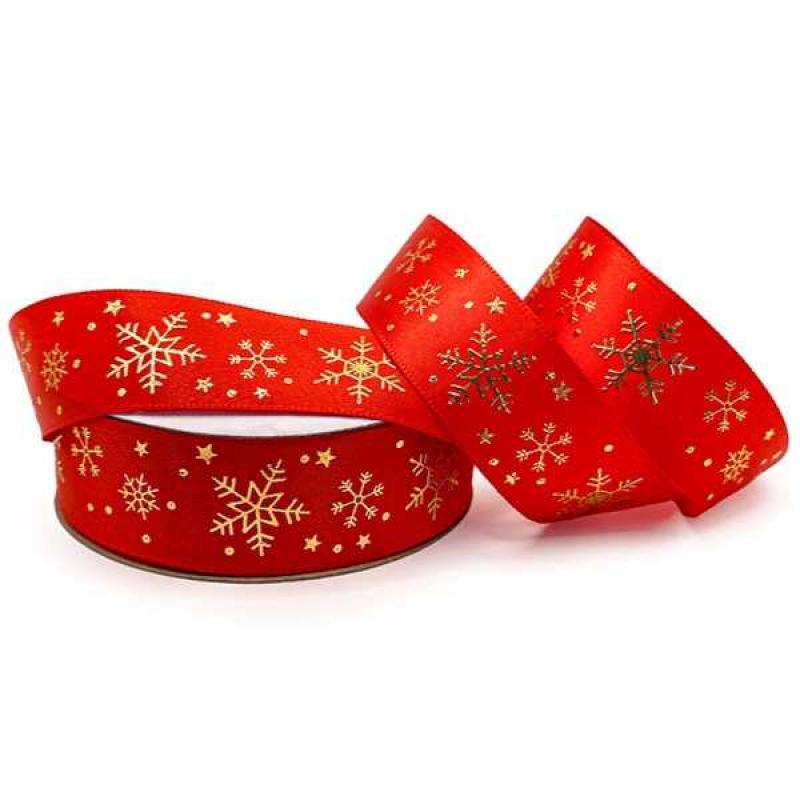 Новогодняя атласная красная лента 2,5 см с золотыми снежинками.
