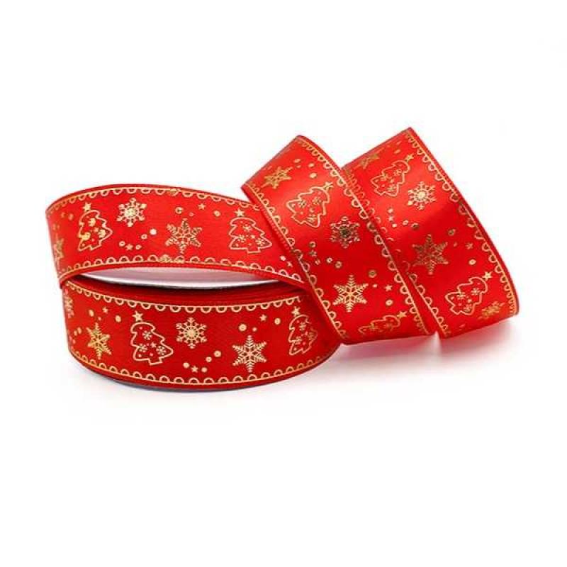 Новогодняя атласная красная лента 2,5 см с золотыми снежинками и ёлками.