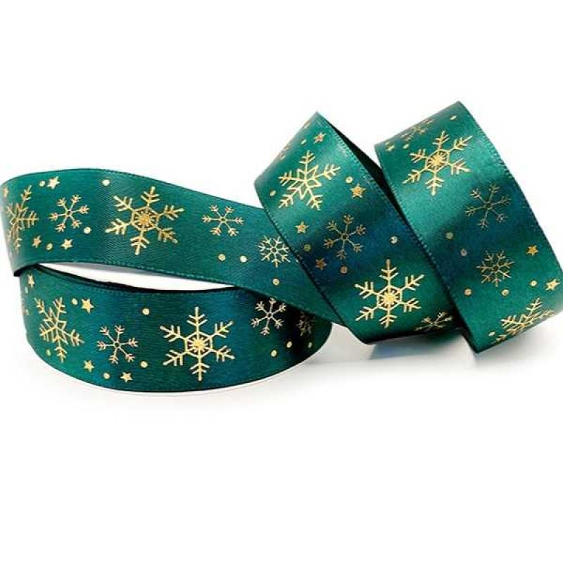 Новогодняя атласная зелёная лента 2,5 см с золотыми снежинками.