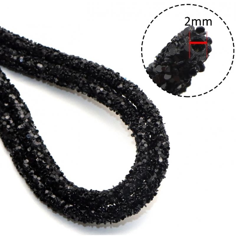 Полый силиконовый чёрный шнур с БЛЕСТКАМИ для создания различной бижутерии: ободков, браслетов, серег, бус и колье. Имеет гибкую структуру, диаметр отверстия 2мм, что позволяет внутрь шнура вдевать мемори проволоку, ободок, либо любую другую основу.